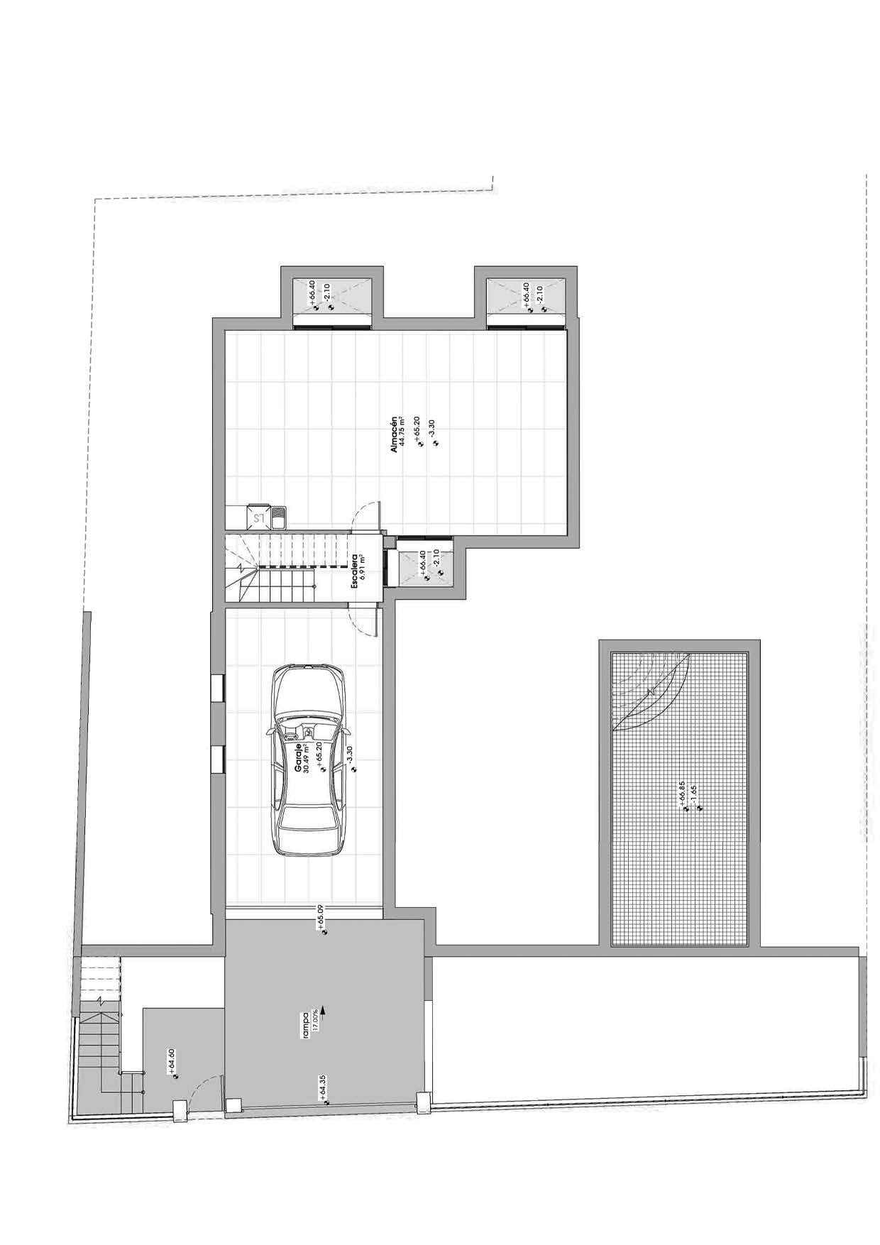Lower underground level: Open space to create another bedroom with bathroom or entertainment area, garage for one car.